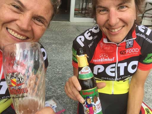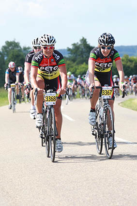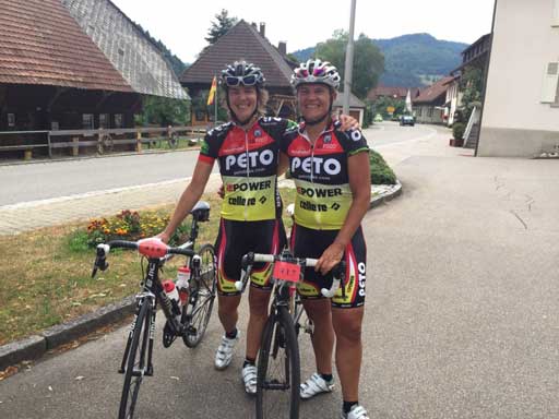 Man sollte nicht glauben, dass es auf der Schwäbischen Alb mörderische Anstiege gibt. Andrea Wolf und Gabriele Bühler wurden bei der Teilnahme eines besseren belehrt. Drei Kilometer lang, auf den ersten 900 Metern 20 Prozent Steigung, auf den ersten 1,7 Kilometern insgesamt 16 Prozent und im letzten Drittel 12 bis 14 Prozent. Das war das Supplement am 28. Juni auf der Classicstrecke mit 190 km und rund 3000 Höhenmetern. Start und Ziel war in Ottenbach. Einem kleinen Ort mit 2000 Einwohnern, wobei über 300 bei der Organisation der Veranstaltung beteiligt waren. Eilig hatte es die beiden nicht und so rollten sie erst kurz nach 6.00 Uhr über die Startlinie. Das hatte den tollen Effekt, dass das ganze Feld von „hinten aufgerollt“ werden konnte. Schnell waren die beiden im Feld als die „Peto-Mädels“ bekannt und einige Mitradler wollte das Geheimnis der schnellen Beine wissen... was natürlich nicht verraten wurde.